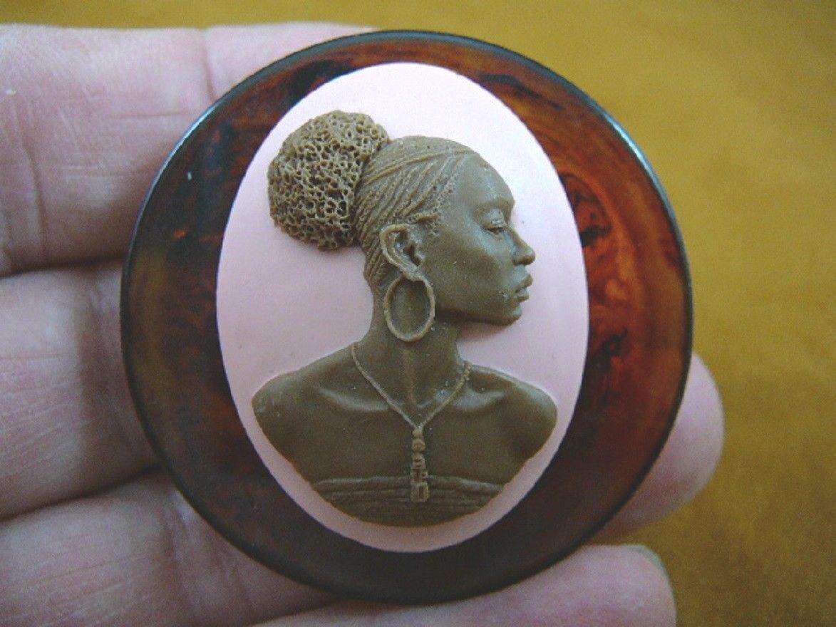 (Internal #CA20-54) Excellent side-view cameo of an African-American woman. New, molded from resin, this is a small cameo pin/pendant in BROWN MILK CHOCOLATE color with LIGHT PINK background color, mounted on vintage tortoise shell color Bakelite backing, pin/pendant is 2" diameter x 3/16" thick. Cameo itself is 1-5/8" long x 1-1/4" wide or 40 x 30 mm. Clasp pin/pendant glued horizontally on the back (see last photo).