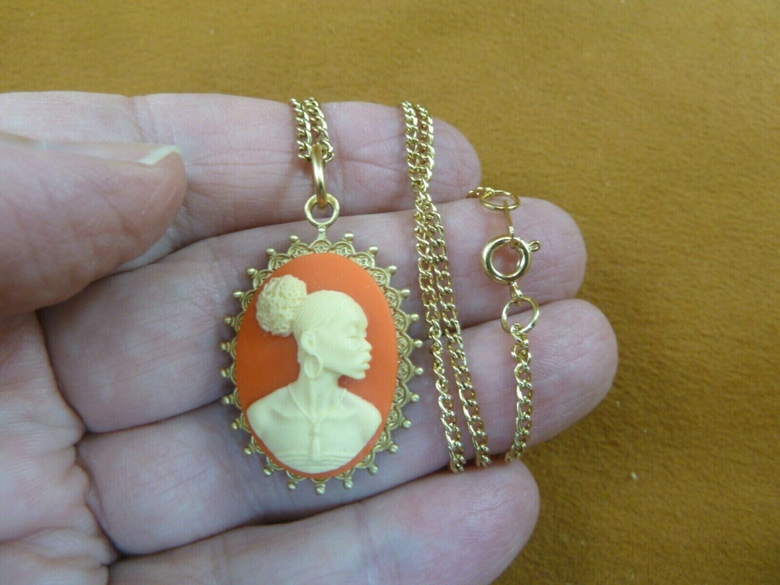 CA10-171) RARE African American LADY orange + ivory CAMEO brass pendant necklace