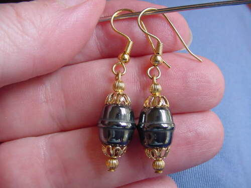 (EE-311) barrel Black hematite bead filigree gold cap wire dangle pair EARRINGS
