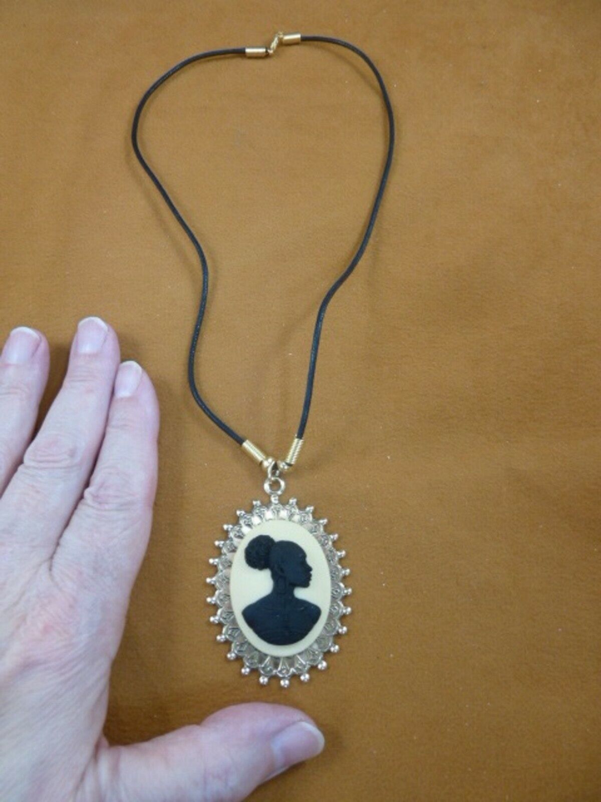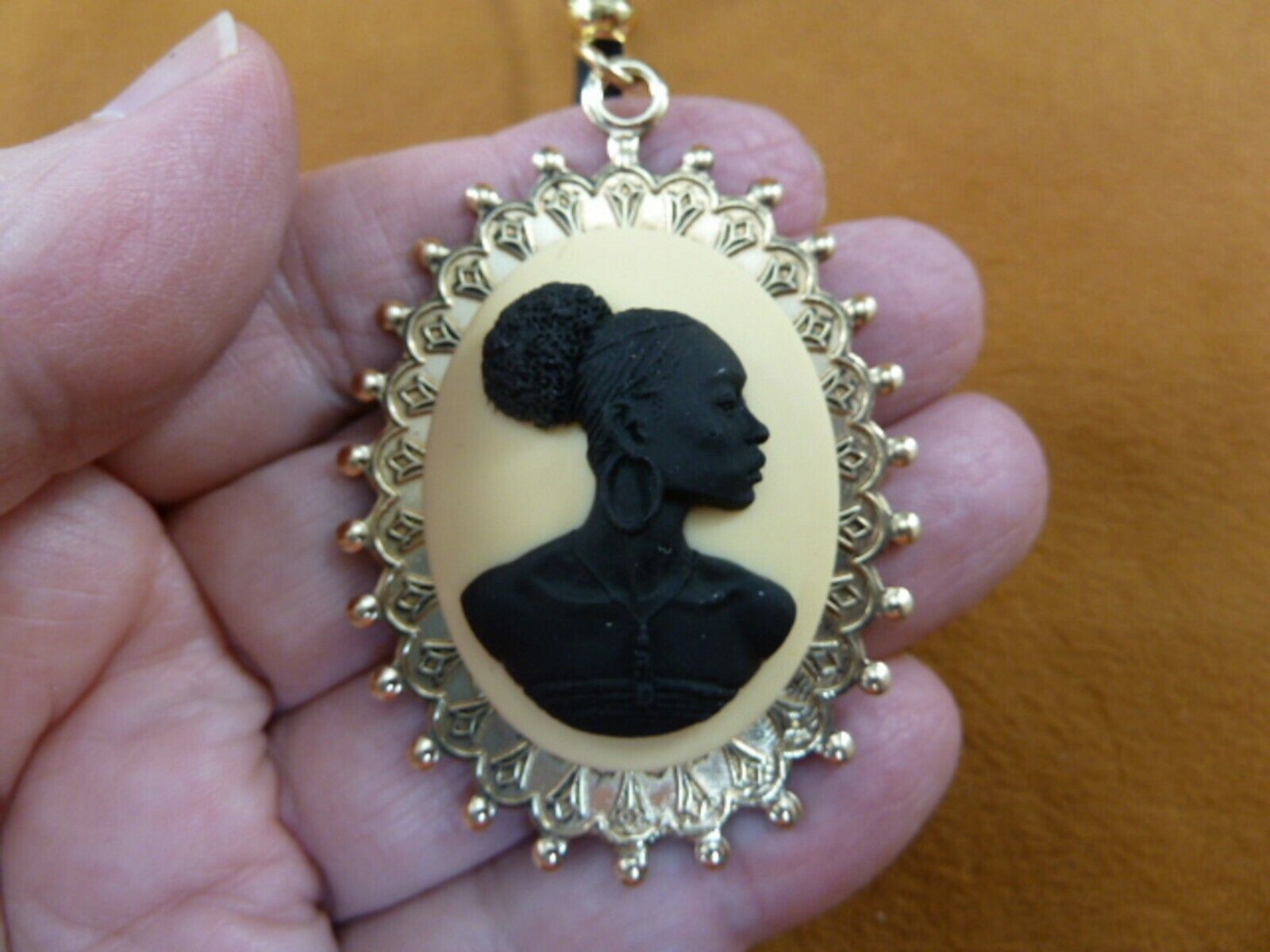 CA20-124) RARE African American LADY ivory + black CAMEO brass pendant necklace