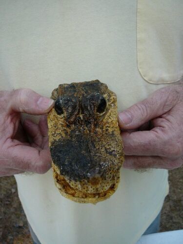AWESOME collectible! No flaws. You can check on the net all you want, you won't find gator heads this large available. Wild gators have been harvested for 200 years, either live from government regulated hunts during the month of September in Louisiana, specific permits issued for rogue gators, or from legal egg collection by Alligator Farms from which gators are raised and a percentage released back to the wild.