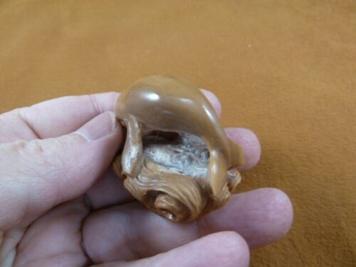 A TAGUA NUT is a seed that comes from the Tagua palm tree (also called ivory nut palm) (Phytelephas Aequatorialis) in Ecuador, South America. The pure cellulose, milky substance inside is edible in liquid or semi-liquid (jello-like) form by people and animals. But once it solidifies in the sun for several months, it is then as hard as ivory (takes a hacksaw to cut) and can be carved. Each fruit pod, covered in a horned husk, the size of grapefruit or melon, contains 4 or more seeds (or nuts) about the size of a hen's egg. Natives that raise these trees do not cut down the rain forests anymore because these trees are now a source of income. These nuts are hand carved and accented with inlaid wood, tagua shell powder, coconut powder and coconut shell. The caramel colored pieces have been briefly deep fried to achieve this color. Often a small spot of brown nut is left on an otherwise all white carving so it is not mistaken for elephant tusk by customs officials. A creative use for a natural item (elephant friendly!) we are pleased to add to our collection of Weird Gifts!