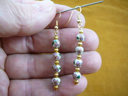 (Internal #EE600-63) You are bidding on a pair of 4-bead white cloisonne earrings 6 mm size, with green pink floral/leaf designs.