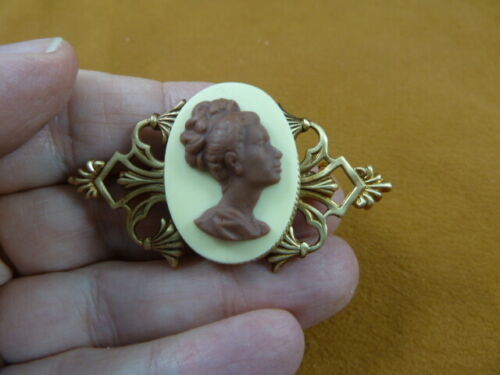 (Internal #CA2-6) Excellent cameo of an African American PROFILE WOMAN. New, molded from natural pine resin, this is a LARGE cameo pin/pendant in MILK CHOCOLATE color with an ANTIQUE IVORY background color, mounted on repro Victorian brass with ornate design. Cameo itself is 1-3/16" long x 15/16" wide. Clasp pin/pendant glued horizontally on the back.
