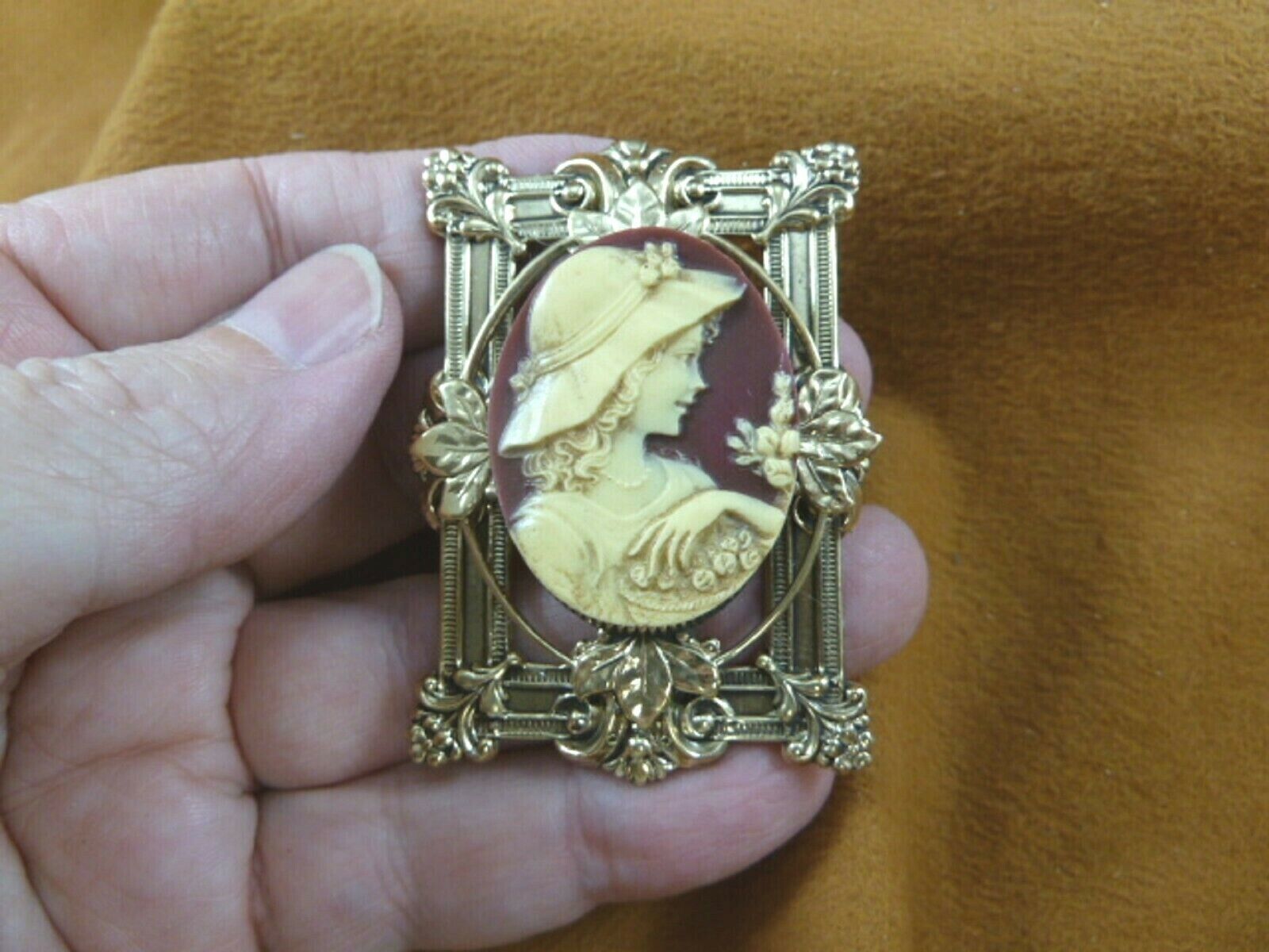 CM10-6) GIRL in Hat Resin burgundy ivory CAMEO flower brass Pin brooch JEWELRY