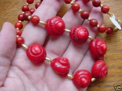 (Internal #V-24) You are bidding on a beautiful, handmade, RED CORAL bead necklace, Round rust red SPONGE coral beads and gold brass rice round beads, with 7 red BAMBOO coral beads carved into shells, 1/2 to 5/8" across. Necklace is 20" long, with gold rhodium safety hook clasp.
