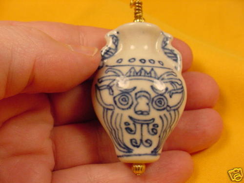 (Internal #J511-7) You are bidding on a Chinese porcelain bead pendant with FACE design, with gold tone brass and pendant loop (wire from loops goes through the bead to the bottom). This is a double sided bead, same front and back, this white and blue bead is hand painted. Pendant is 2" long x 1-3/8" wide.