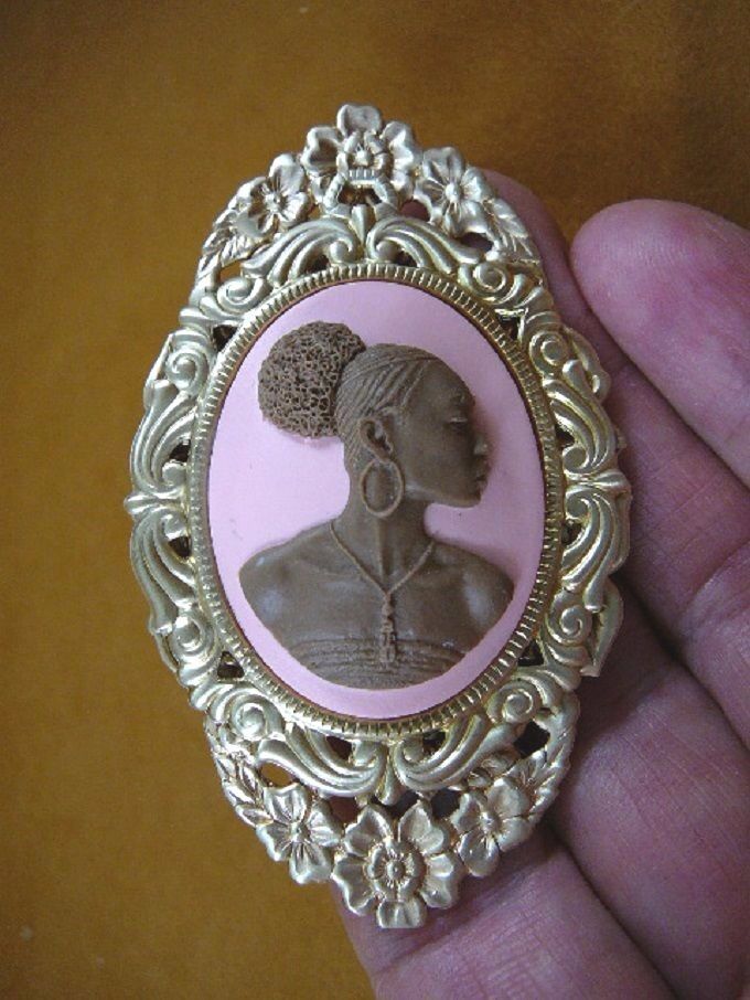 (Internal #CA20-8) Excellent side-view cameo of an African-American woman. New, molded from resin, this is a large cameo pin/pendant in MILK CHOCOLATE BROWN color with PINK background, mounted on repro Victorian brass, pin/pendant is 3" long x 1-7/8" wide. Cameo itself is 1-5/8" long x 1-1/4" wide or 40 x 30 mm. Clasp pin/pendant glued horizontally on the back (see last photo for an example).