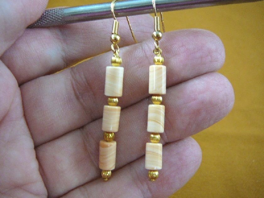 (Internal #EE-488-9) This is a beautiful pair of RARE GENUINE HELMET SHELL (pink coral color), three 8x5 mm cylinder shaped bead dangle earrings with gold tone brass bead accents, on gold tone hypoallergenic french wires.