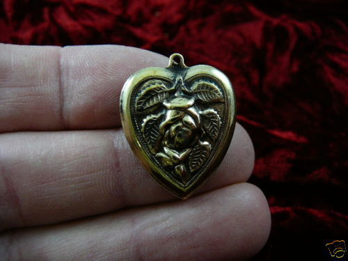 (Internal #B-HEART-9) This is a beautiful pin/pendant (glued on the back) made of piece of heart shaped Victorian brass with detailed rose flower design, 1-1/8" long x 15/16" wide. This gorgeous reproduction Victorian stamped brass is antiqued, then buffed to create some shine. ?BRASS IS A GOLD COLOR?.
