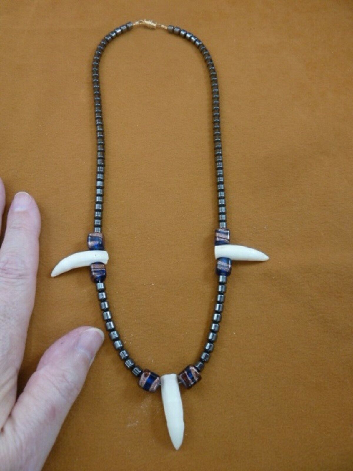 (G159-703) THREE 1-1/4" GATOR Aligator Teeth Hematite gemstone + blue NECKLACE
