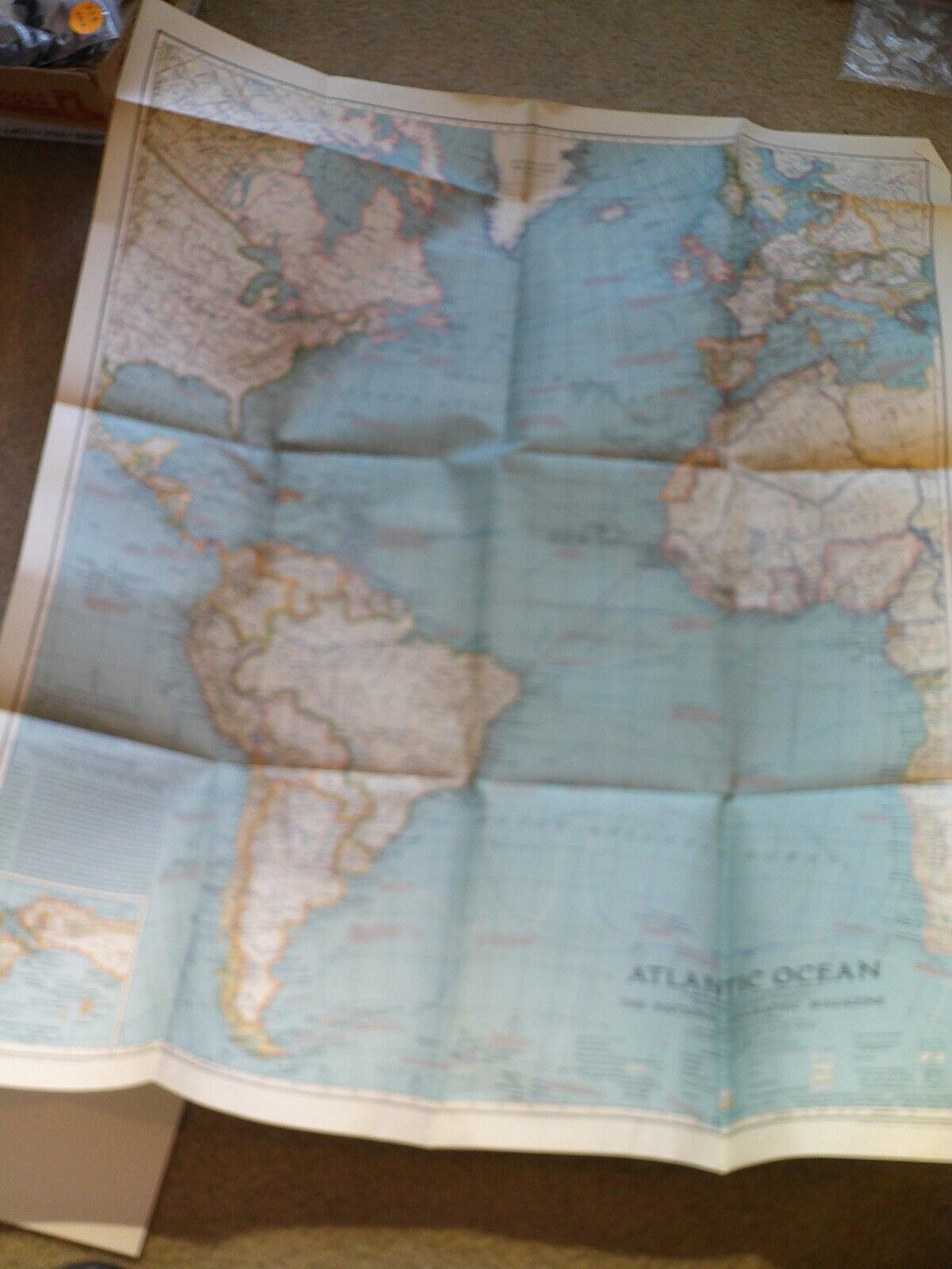 are bidding on a nice, large old, original 1939 dated, folded map from the National Geographic Society, a historical map of the Atlantic Ocean. About 31 inches tall, 24 3/4 inches wide. Light wear for a folded map with light wrinkles, great piece to frame. Zoom in for details.