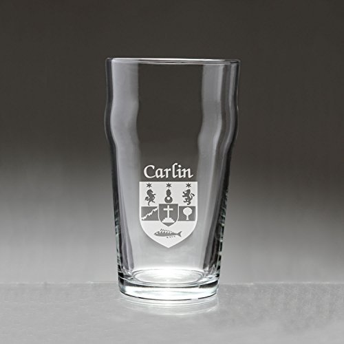 Product description: Carlin Irish Coat of Arms Pub GlassesMade for comfort, the Pub Glass is less likely to slip out of your hand thanks to the lovely "hip" around the middle. This style of glass is sometimes called a Nonic Pint Glass or Imperial Pint Glass. The final stroke of genius is your Irish family name and coat of arms sand-etched on the side. 20 oz. in size and dishwasher and microwave safe. Choose from over 1200 available family coat of arms. USA. Authentic Irish Family Coat of Arms Over 25 years of Heraldry Research Set of 4 Irish Coat of Arms Pub Glasses (Sand Etched) High quality sand etching with heavy base Each glass holds a large 20 ounces of your favorite beverageShape improves grip strength :)Product Size:Height - 6 inhesBottom Diameter- 2.5 inchesMaximum Diameter - 3.5 inchesTop Diameter - 3.25 inchesCapacity - 20 ounces