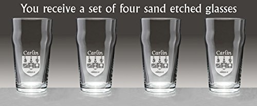 Carlin Irish Coat of Arms Pub GlassesMade for comfort, the Pub Glass is less likely to slip out of your hand thanks to the lovely "hip" around the middle. This style of glass is sometimes called a Nonic Pint Glass or Imperial Pint Glass. The final stroke of genius is your Irish family name and coat of arms sand-etched on the side. 20 oz. in size and dishwasher and microwave safe. Choose from over 1200 available family coat of arms. USA. Authentic Irish Family Coat of Arms Over 25 years of Heraldry Research Set of 4 Irish Coat of Arms Pub Glasses (Sand Etched) High quality sand etching with heavy base Each glass holds a large 20 ounces of your favorite beverageShape improves grip strength :)Product Size:Height - 6 inhesBottom Diameter- 2.5 inchesMaximum Diameter - 3.5 inchesTop Diameter - 3.25 inchesCapacity - 20 ounces