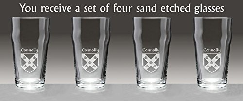 Product description: Connolly Irish Coat of Arms Pub GlassesMade for comfort, the Pub Glass is less likely to slip out of your hand thanks to the lovely "hip" around the middle. This style of glass is sometimes called a Nonic Pint Glass or Imperial Pint Glass. The final stroke of genius is your Irish family name and coat of arms sand-etched on the side. 20 oz. in size and dishwasher and microwave safe. Choose from over 1200 available family coat of arms. USA. Authentic Irish Family Coat of Arms Over 25 years of Heraldry Research Set of 4 Irish Coat of Arms Pub Glasses (Sand Etched) High quality sand etching with heavy base Each glass holds a large 20 ounces of your favorite beverageShape improves grip strength :)Product Size:Height - 6 inhesBottom Diameter- 2.5 inchesMaximum Diameter - 3.5 inchesTop Diameter - 3.25 inchesCapacity - 20 ounces