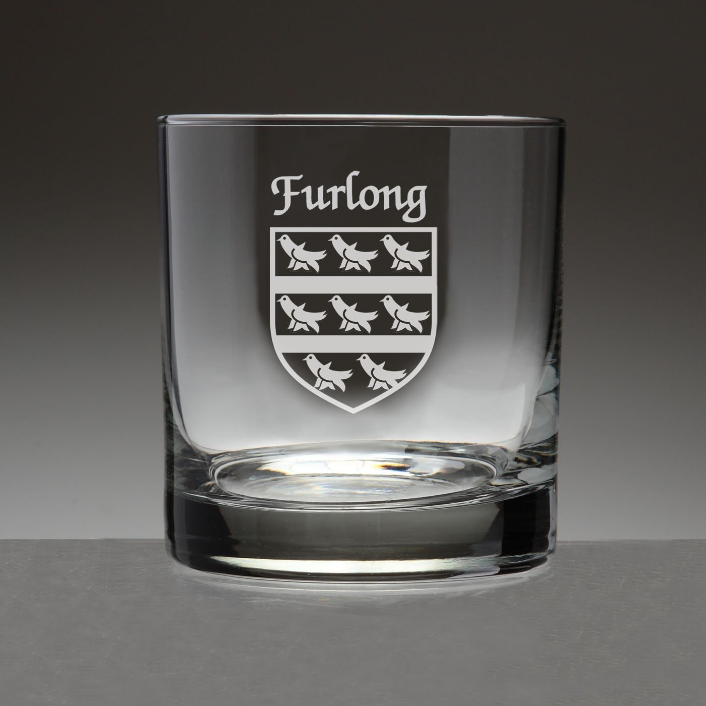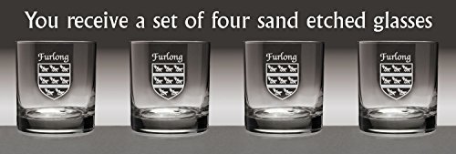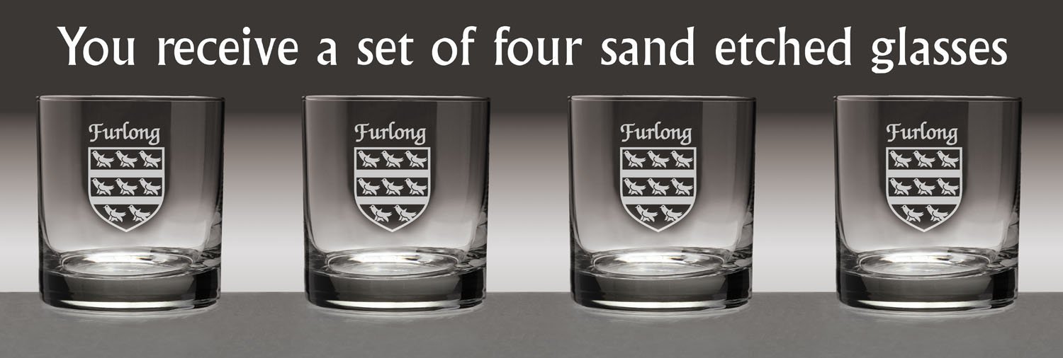 Furlong Irish Coat of Arms Tumbler Glasses If ye'll be havin' a wee bit of the Jameson whiskey on a cool evening, this will be the glass. Or Scotch, neat. A Cosmopolitan, perhaps. Or just a spot of lemonade, for that matter. Nicely balanced, clean-lined and just plain grown-up, the Tumbler's dignity is heightened by a sand-etched Irish coat of arms and family name. Why not yours? 11 oz. in size and dishwasher safe. Choose from over 1000 available Irish crests. USA.Washing Instructions:Dishwasher and microwave safe. Authentic Irish Family Coat of Arms Over 25 years of Heraldry Research Set of 4 Irish Coat of Arms Tumbler Glasses (Sand Etched) High quality sand etching with extra heavy basepattern:heavy basebottom diameter:3-3/16"maximum diameter:3-1/4"capacity:11 oz product height:3-1/2"