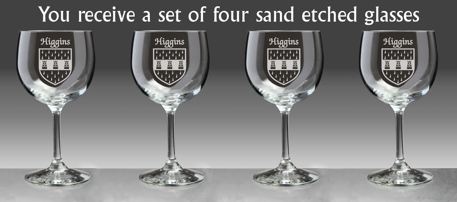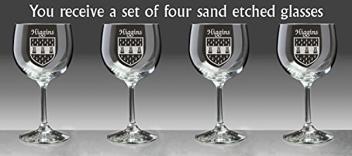Higgins Irish Coat of Arms Red Wine Glasses We couldn't pick just any red wine glass to carry your Irish family coat of arms. This stemware set contains four wonderfully-sized, exquisitely-balanced, stemmed wine glasses. Equally at home with red or white wine, but ideal for red wines, with elegant proportions but a robust constitution. Sand-etched with your surname and coat of arms. The ideal gift for anyone with an Irish branch on their family tree. 13 1/2 oz., and permanently sand-etched image. Choose from over 1200 available coat of arms. Authentic Irish Family Coat of Arms Over 25 years of Heraldry Research Set of 4 Irish Coat of Arms Red wine Glasses (Sand Etched) High quality sand etching Each glass holds 13 1/2 ounces of your Wine Washing Instructions:Dishwasher and microwave safe. Beadless, polished Dura-Temp edgeEnhanced bowl thickness for extra durabilityBottom diameter: 3-1/4"Maximum diameter: 3-5/8"Capacity: 13-1/2 ozProduct height: 6-7/8"Material: glassColor: clearTop diameter: 3-1/4"