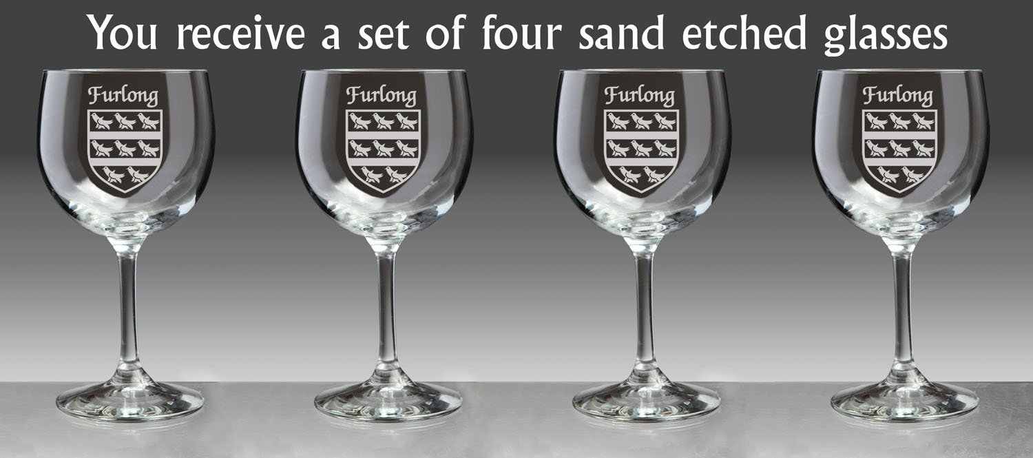 Furlong Irish Coat of Arms Red Wine Glasses We couldn't pick just any red wine glass to carry your Irish family coat of arms. This stemware set contains four wonderfully-sized, exquisitely-balanced, stemmed wine glasses. Equally at home with red or white wine, but ideal for red wines, with elegant proportions but a robust constitution. Sand-etched with your surname and coat of arms. The ideal gift for anyone with an Irish branch on their family tree. 13 1/2 oz., and permanently sand-etched image. Choose from over 1200 available coat of arms. Authentic Irish Family Coat of Arms Over 25 years of Heraldry Research Set of 4 Irish Coat of Arms Red wine Glasses (Sand Etched) High quality sand etching Each glass holds 13 1/2 ounces of your Wine Washing Instructions:Dishwasher and microwave safe. Beadless, polished Dura-Temp edgeEnhanced bowl thickness for extra durabilityBottom diameter: 3-1/4"Maximum diameter: 3-5/8"Capacity: 13-1/2 ozProduct height: 6-7/8"Material: glassColor: clearTop diameter: 3-1/4"