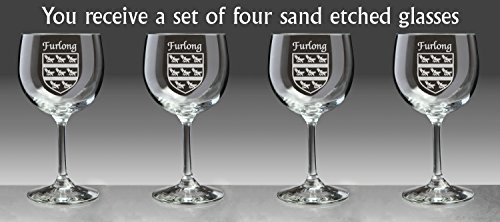 Product description: Furlong Irish Coat of Arms Red Wine Glasses We couldn't pick just any red wine glass to carry your Irish family coat of arms. This stemware set contains four wonderfully-sized, exquisitely-balanced, stemmed wine glasses. Equally at home with red or white wine, but ideal for red wines, with elegant proportions but a robust constitution. Sand-etched with your surname and coat of arms. The ideal gift for anyone with an Irish branch on their family tree. 13 1/2 oz., and permanently sand-etched image. Choose from over 1200 available coat of arms. Authentic Irish Family Coat of Arms Over 25 years of Heraldry Research Set of 4 Irish Coat of Arms Red wine Glasses (Sand Etched) High quality sand etching Each glass holds 13 1/2 ounces of your Wine Washing Instructions:Dishwasher and microwave safe. Beadless, polished Dura-Temp edgeEnhanced bowl thickness for extra durabilityBottom diameter: 3-1/4"Maximum diameter: 3-5/8"Capacity: 13-1/2 ozProduct height: 6-7/8"Material: glassColor: clearTop diameter: 3-1/4"