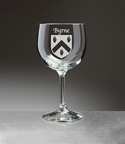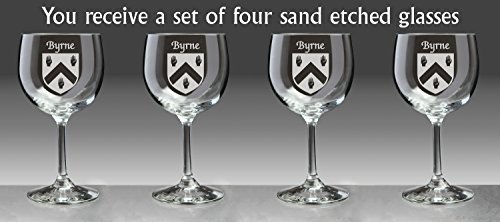 Byrne Irish Coat of Arms Red Wine Glasses We couldn't pick just any red wine glass to carry your Irish family coat of arms. This stemware set contains four wonderfully-sized, exquisitely-balanced, stemmed wine glasses. Equally at home with red or white wine, but ideal for red wines, with elegant proportions but a robust constitution. Sand-etched with your surname and coat of arms. The ideal gift for anyone with an Irish branch on their family tree. 13 1/2 oz., and permanently sand-etched image. Choose from over 1200 available coat of arms. Authentic Irish Family Coat of Arms Over 25 years of Heraldry Research Set of 4 Irish Coat of Arms Red wine Glasses (Sand Etched) High quality sand etching Each glass holds 13 1/2 ounces of your Wine Washing Instructions:Dishwasher and microwave safe. Beadless, polished Dura-Temp edgeEnhanced bowl thickness for extra durabilityBottom diameter: 3-1/4"Maximum diameter: 3-5/8"Capacity: 13-1/2 ozProduct height: 6-7/8"Material: glassColor: clearTop diameter: 3-1/4"