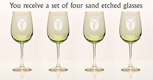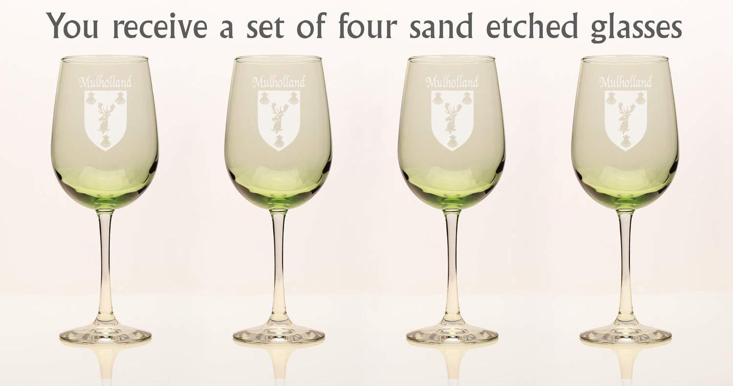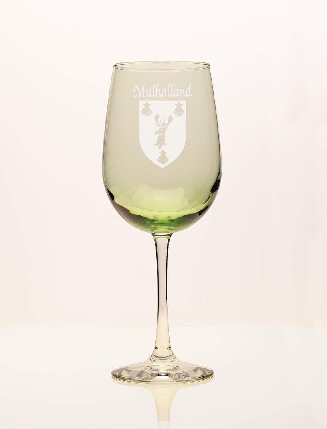 Mulholland Irish Coat of Arms Green Wine Glasses - Set of 4. What occasion couldn't be made more special with a toast? And how special would it be to toast with wine glasses etched with your authentic Irish name and coat of arms, now in our brand new, elegant green color? For your most special occasions, or everyday weekday dinners, choose this durable, well-balanced and elegant wine glass, suitable for white or red. Each Irish coat of arms wine glass is permanently and professionally sand-etched with your surname and family crest. 17 oz. Choose from over 1000 available coat of arms.