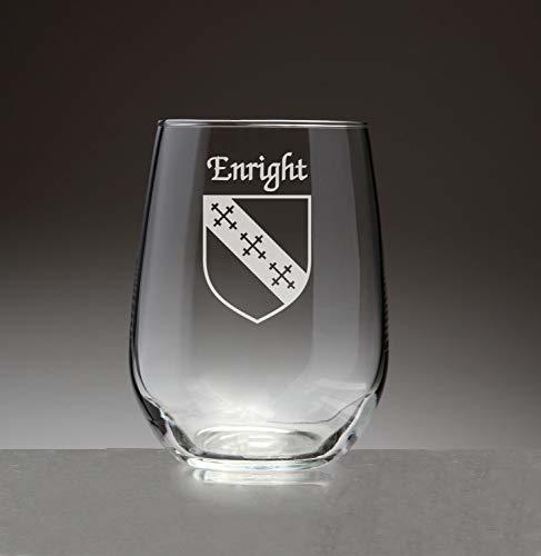 Enright Irish Coat of Arms Stemless Wine Glass Set - Set of 4 (Sand Etched). People choose stemless wine glasses for many reasons. Some love the way it provides a handhold to look, swirl, smell and taste fine wine. Others appreciate the way it looks on the table. This new shape in wineglasses is growing in popularity. Add your authentic Irish name and coat of arms, finely etched on each glass, and it becomes a truly unique and modern heirloom. For your most special occasions, or everyday weekday dinners, choose this durable, well-balanced and elegant wine glass, suitable for white or red. Each Irish coat of arms wine glass is permanently and professionaly sand-etched with your surname and family crest. Choose from over 1000 available coat of arms. Dishwasher and microwave safe. Authentic Irish Family Coat of Arm. Over 25 years of Heraldry Research. Set of 4 Irish Coat of Arms Stemless wine Glasses. High quality sand etching. Each glass holds 15 1/2 ounces of your favorite beverage.
