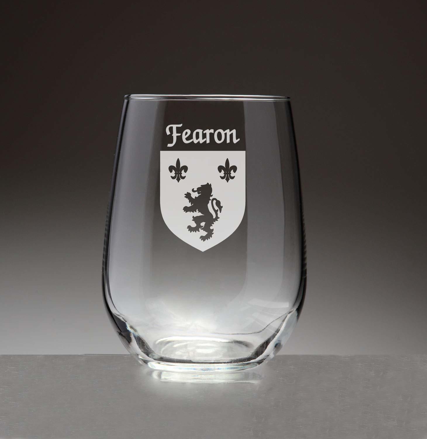 Fearon Irish Coat of Arms Stemless Wine Glass Set - Set of 4 (Sand Etched). People choose stemless wine glasses for many reasons. Some love the way it provides a handhold to look, swirl, smell and taste fine wine. Others appreciate the way it looks on the table. This new shape in wineglasses is growing in popularity. Add your authentic Irish name and coat of arms, finely etched on each glass, and it becomes a truly unique and modern heirloom. For your most special occasions, or everyday weekday dinners, choose this durable, well-balanced and elegant wine glass, suitable for white or red. Each Irish coat of arms wine glass is permanently and professionaly sand-etched with your surname and family crest. Choose from over 1000 available coat of arms. Dishwasher and microwave safe. Authentic Irish Family Coat of Arm. Over 25 years of Heraldry Research. Set of 4 Irish Coat of Arms Stemless wine Glasses. High quality sand etching. Each glass holds 15 1/2 ounces of your favorite beverage.