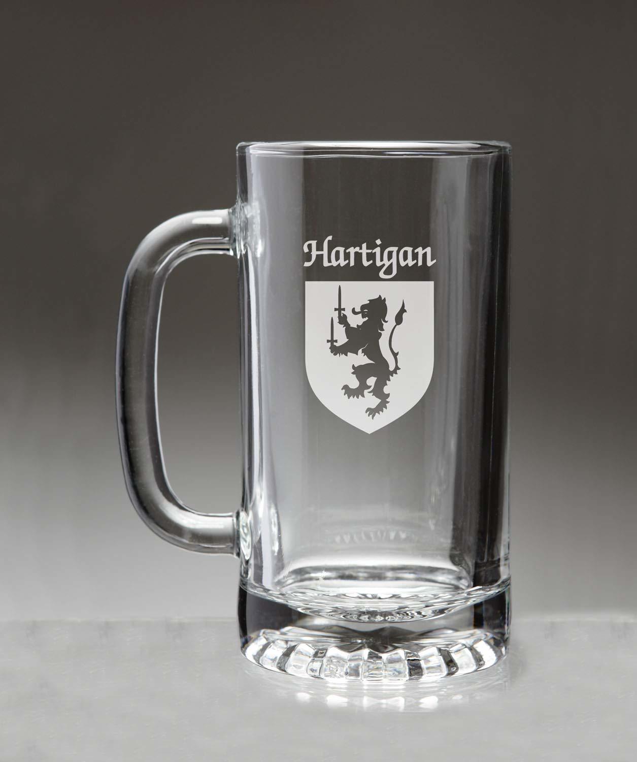 Hartigan Irish Coat of Arms Beer Mug . This is the big beer mug with the handle that allows you to swing your glass while you're singing that Irish song. Or maybe just to have a drink with a heavy handled friend. High quality sand etched with your authentic Irish coat of arms and family name. Dishwasher and microwave safe. Capacity 16 oz and heavy duty double walled clear glass with handle. Choose from over 1200 available family Irish crests. Authentic Irish Family Coat of Arms. Over 25 years of Heraldry Research. Irish Coat of Arms Beer mug. High quality sand etching. Each glass holds 16 ounces of your favorite beverage.