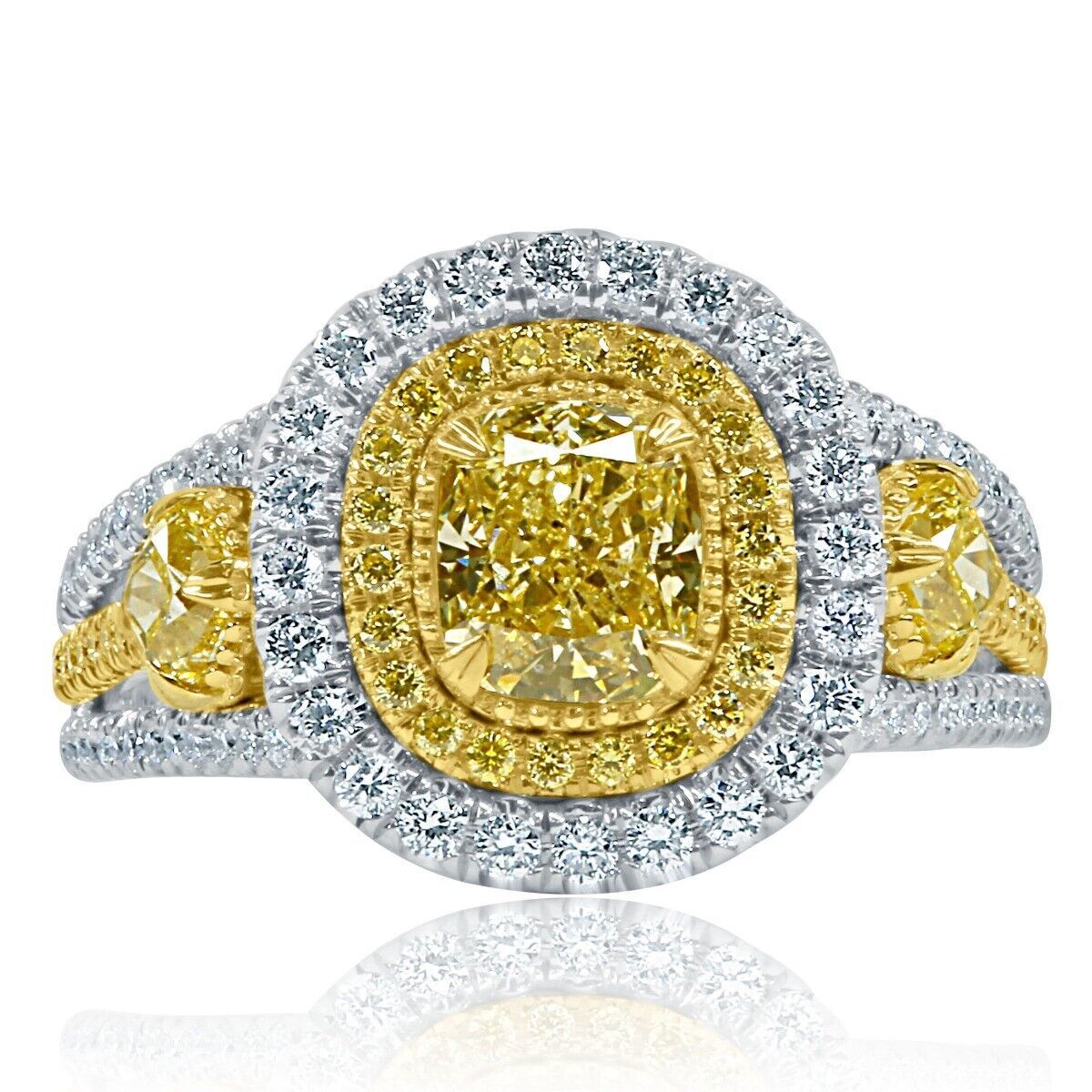 No many rings will get as much attention as this sparkler!! This beautiful one-of-a-kind engagement ring showcases a 0.85 carat GIA certified cushion brilliant cut natural fancy yellow diamond surrounded by a double halo of sparkling round cut colorless and yellow diamonds. Additional diamonds continue down the three row shank with 2 cushion cut side natural fancy yellow diamonds and the detailing on the gallery, creating a shimmering look of this ring. Handcrafted in 18-karat multi tone gold and completed with a high polish finish. The total carat weight is 1.88 carats.