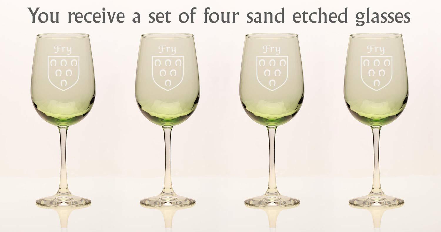 Fry Irish Coat of Arms Green Wine Glasses - Set of 4. What occasion couldn't be made more special with a toast? And how special would it be to toast with wine glasses etched with your authentic Irish name and coat of arms, now in our brand new, elegant green color? For your most special occasions, or everyday weekday dinners, choose this durable, well-balanced and elegant wine glass, suitable for white or red. Each Irish coat of arms wine glass is permanently and professionally sand-etched with your surname and family crest. 17 oz. Choose from over 1000 available coat of arms.