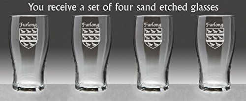 Furlong Irish Coat of Arms Tavern GlassesDanger: Curves ahead! From her hand-sized base to the gentle swell of her keel, this style of glassware is an age-old tradition on oaken bars all over the Celtic isles because of the wonderful balance, weight and durability she brings to the table.An official standard Irish pint at 20 oz., the Coat of Arms Tavern Glass features your permanently sand-etched Irish family coat of arms. Microwave and dishwasher safe.Choose from over 1200 available family Irish crests. Authentic Irish Family Coat of Arms Over 25 years of Heraldry Research Set of 4 Irish Coat of Arms Tavern Glasses (Sand Etched) High quality sand etchingEach glass holds 20 ounces of your favorite beverage