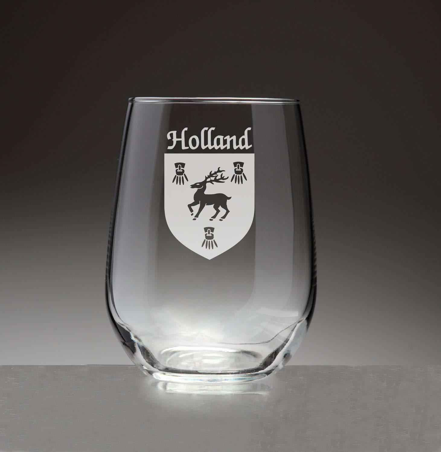Holland Irish Coat of Arms Stemless Wine Glass Set - Set of 4 (Sand Etched). People choose stemless wine glasses for many reasons. Some love the way it provides a handhold to look, swirl, smell and taste fine wine. Others appreciate the way it looks on the table. This new shape in wineglasses is growing in popularity. Add your authentic Irish name and coat of arms, finely etched on each glass, and it becomes a truly unique and modern heirloom. For your most special occasions, or everyday weekday dinners, choose this durable, well-balanced and elegant wine glass, suitable for white or red. Each Irish coat of arms wine glass is permanently and professionaly sand-etched with your surname and family crest. Choose from over 1000 available coat of arms. Dishwasher and microwave safe. Authentic Irish Family Coat of Arm. Over 25 years of Heraldry Research. Set of 4 Irish Coat of Arms Stemless wine Glasses. High quality sand etching. Each glass holds 15 1/2 ounces of your favorite beverage.