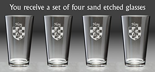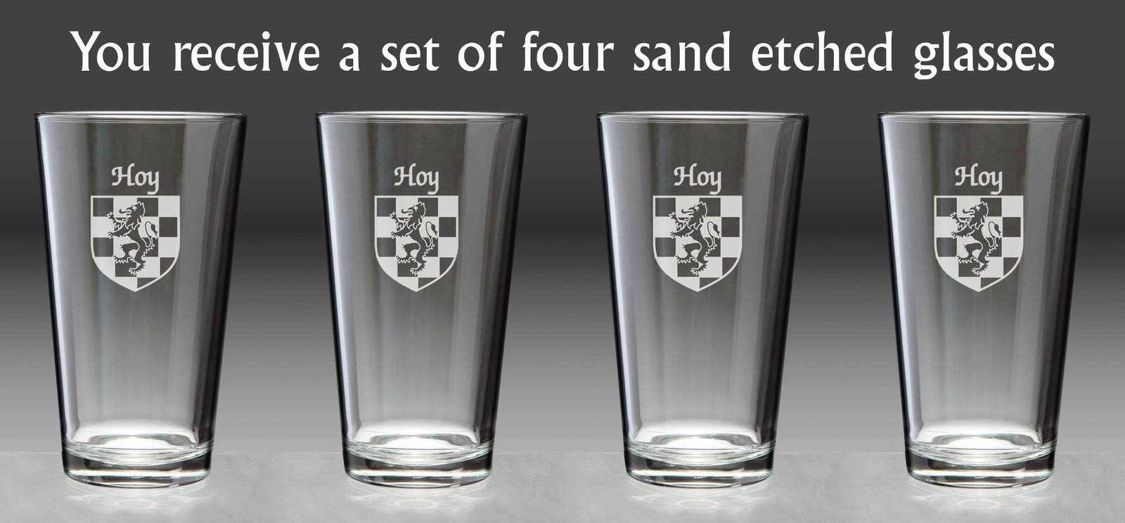 Hoy Irish Coat of Arms Pint GlassesDid you know that the standard 20 oz. pint glass is enforced by the National Standards Authority of Ireland? A full Irish pint is a tradition (and a duty). The Irish Rose can etch over 1000 Irish family names and authentic coats of arms on these high-quality, recognizably Irish Pint Glasses. A perfect wedding, groomsman, reunion, any-occasion gift.20 oz., permanently sand-etched authentic Irish coat-of-arms, and dishwasher safe. Choose from over 1000 available family crests.Washing Instructions:Dishwasher and microwave safe. Authentic Irish Family Coat of Arms Over 25 years of Heraldry Research Set of 4 Irish Coat of Arms Pint Glasses (Sand Etched) High quality sand etching with extra heavy base capacity: 20 Ozmaterial: Glassproduct height: 6-3/8"bottom diameter: 2-1/2"top diameter: 3-3/4"