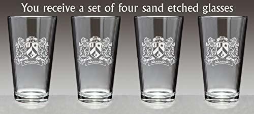 Alexander Irish Coat of Arms Pint Glasses - Set of 4 (Sand etched) with our full coat of arms with lions and all. Did you know that the standard 20 oz. pint glass is enforced by the National Standards Authority of Ireland? A full Irish pint is a tradition (and a duty). The Irish Rose can etch over 1000 Irish family names and authentic coats of arms on these high-quality, recognizably Irish Pint Glasses. A perfect wedding, groomsman, reunion, any-occasion gift. Choose from over 1000 available family crests. Authentic Irish Family Coat of Arms. Over 25 years of Heraldry Research. Set of 4 Irish Coat of Arms Pint Glasses (Sand Etched). High quality sand etching with extra heavy base.capacity: 20 Oz. Product height: 6-3/8". Bottom diameter: 2-1/2". Top diameter: 3-3/4".