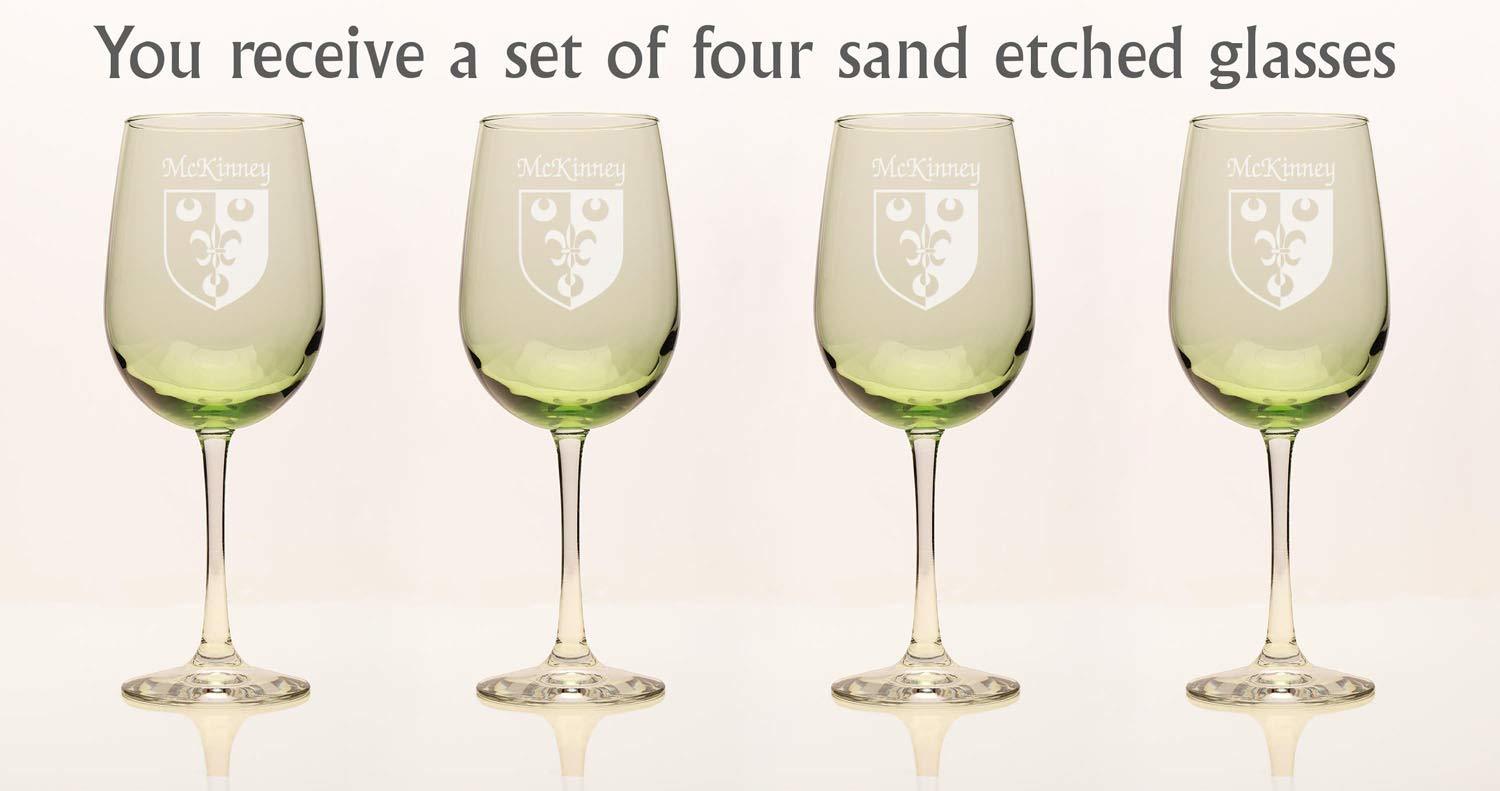 McKinney Irish Coat of Arms Green Wine Glasses - Set of 4. What occasion couldn't be made more special with a toast? And how special would it be to toast with wine glasses etched with your authentic Irish name and coat of arms, now in our brand new, elegant green color? For your most special occasions, or everyday weekday dinners, choose this durable, well-balanced and elegant wine glass, suitable for white or red. Each Irish coat of arms wine glass is permanently and professionally sand-etched with your surname and family crest. 17 oz. Choose from over 1000 available coat of arms.
