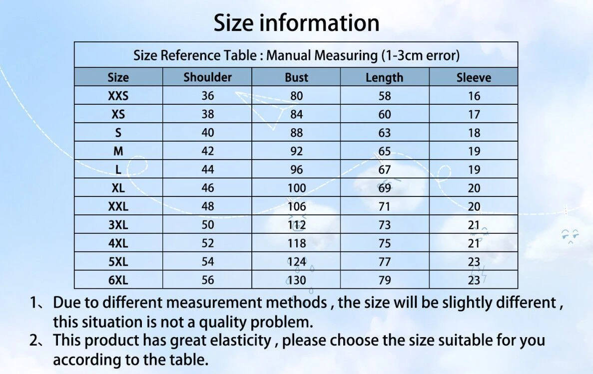 Size: Asian size XXS-6XL?pls check the size chart before ordering, thank you!)