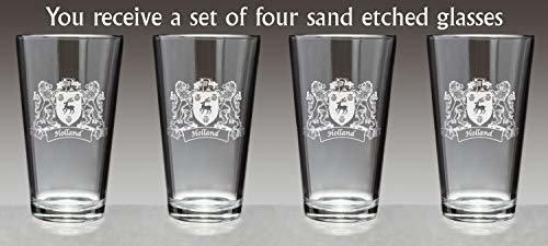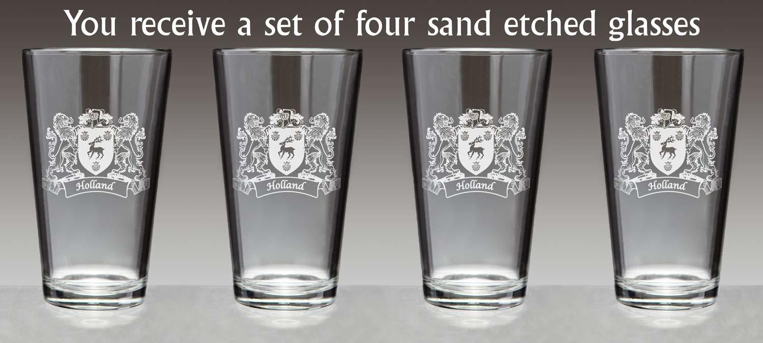 Holland Irish Coat of Arms Pint Glasses - Set of 4 (Sand etched) with our full coat of arms with lions and all. Did you know that the standard 20 oz. pint glass is enforced by the National Standards Authority of Ireland? A full Irish pint is a tradition (and a duty). The Irish Rose can etch over 1000 Irish family names and authentic coats of arms on these high-quality, recognizably Irish Pint Glasses. A perfect wedding, groomsman, reunion, any-occasion gift. Choose from over 1000 available family crests. Authentic Irish Family Coat of Arms. Over 25 years of Heraldry Research. Set of 4 Irish Coat of Arms Pint Glasses (Sand Etched). High quality sand etching with extra heavy base.capacity: 20 Oz. Product height: 6-3/8". Bottom diameter: 2-1/2". Top diameter: 3-3/4".