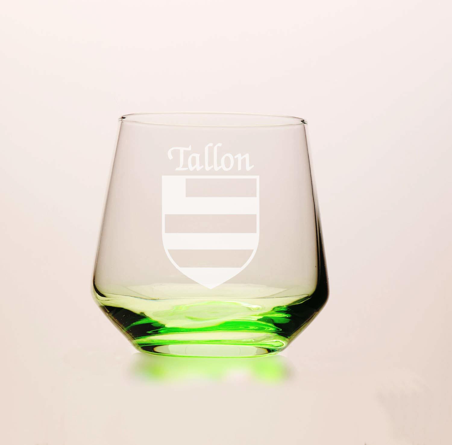 Tallon Irish Coat of Arms Green Tumbler Glasses - Set of 4 (Sand Etched). Whether you're having a glass of whiskey or scotch, a cocktail or just a glass of water, this brand new green tinted tumbler glass is the perfect choice. The new green color shines and reflects at different angles to beautifully remind you of the green pastures of Ireland with every sip. Each Irish coat of arms tumbler glass is permanently and professionally sand-etched with your surname and family crest. 13 oz. Choose from over 1000 available coat of arms.