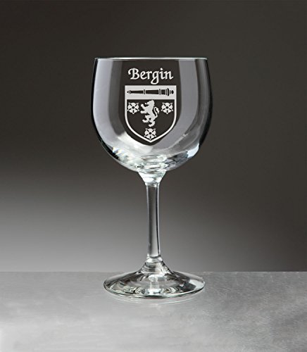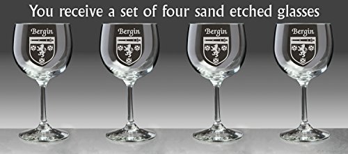 Bergin Irish Coat of Arms Red Wine Glasses We couldn't pick just any red wine glass to carry your Irish family coat of arms. This stemware set contains four wonderfully-sized, exquisitely-balanced, stemmed wine glasses. Equally at home with red or white wine, but ideal for red wines, with elegant proportions but a robust constitution. Sand-etched with your surname and coat of arms. The ideal gift for anyone with an Irish branch on their family tree. 13 1/2 oz., and permanently sand-etched image. Choose from over 1200 available coat of arms. Authentic Irish Family Coat of Arms Over 25 years of Heraldry Research Set of 4 Irish Coat of Arms Red wine Glasses (Sand Etched) High quality sand etching Each glass holds 13 1/2 ounces of your Wine Washing Instructions:Dishwasher and microwave safe. Beadless, polished Dura-Temp edgeEnhanced bowl thickness for extra durabilityBottom diameter: 3-1/4"Maximum diameter: 3-5/8"Capacity: 13-1/2 ozProduct height: 6-7/8"Material: glassColor: clearTop diameter: 3-1/4"