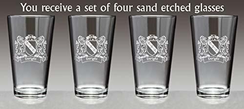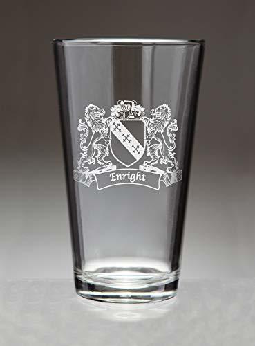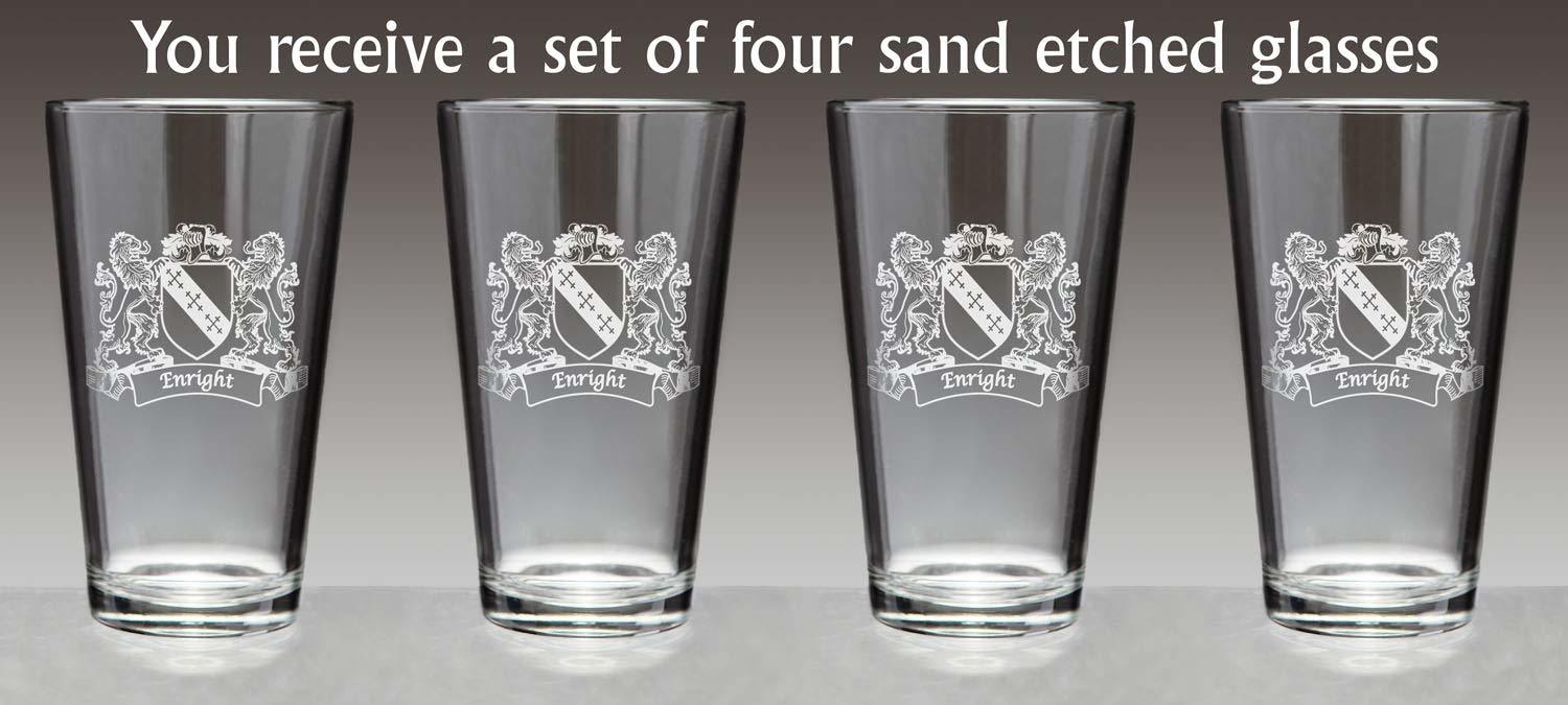 Enright Irish Coat of Arms Pint Glasses - Set of 4 (Sand etched) with our full coat of arms with lions and all. Did you know that the standard 20 oz. pint glass is enforced by the National Standards Authority of Ireland? A full Irish pint is a tradition (and a duty). The Irish Rose can etch over 1000 Irish family names and authentic coats of arms on these high-quality, recognizably Irish Pint Glasses. A perfect wedding, groomsman, reunion, any-occasion gift. Choose from over 1000 available family crests. Authentic Irish Family Coat of Arms. Over 25 years of Heraldry Research. Set of 4 Irish Coat of Arms Pint Glasses (Sand Etched). High quality sand etching with extra heavy base.capacity: 20 Oz. Product height: 6-3/8". Bottom diameter: 2-1/2". Top diameter: 3-3/4".