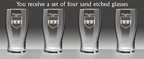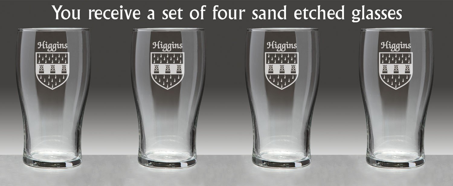 Higgins Irish Coat of Arms Tavern GlassesDanger: Curves ahead! From her hand-sized base to the gentle swell of her keel, this style of glassware is an age-old tradition on oaken bars all over the Celtic isles because of the wonderful balance, weight and durability she brings to the table.An official standard Irish pint at 20 oz., the Coat of Arms Tavern Glass features your permanently sand-etched Irish family coat of arms. Microwave and dishwasher safe.Choose from over 1200 available family Irish crests. Authentic Irish Family Coat of Arms Over 25 years of Heraldry Research Set of 4 Irish Coat of Arms Tavern Glasses (Sand Etched) High quality sand etchingEach glass holds 20 ounces of your favorite beverage