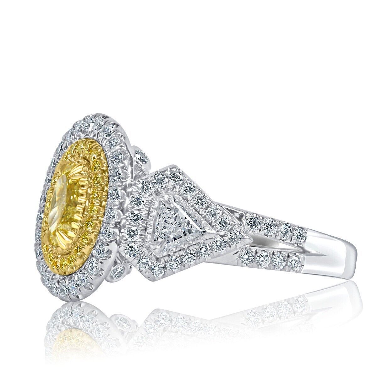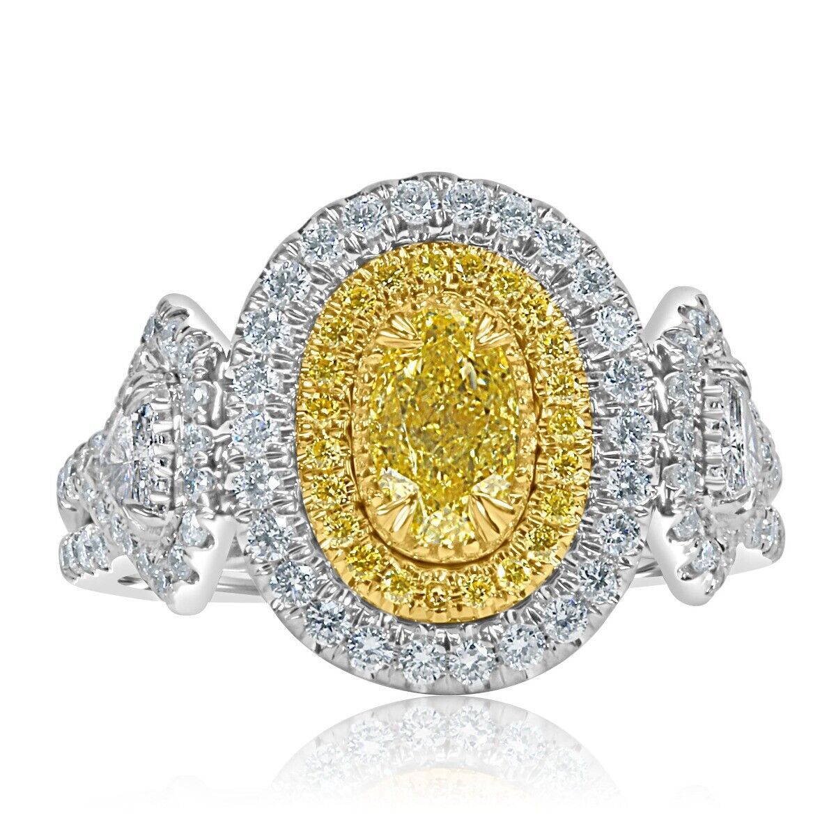 No many rings will get as much attention as this sparkler! This spectacular engagement ring showcases a 0.55 carat GIA certified natural fancy yellow oval brilliant cut diamond embraced by two trillion shaped side colorless diamonds. The double halo of glittering colorless and yellow round cut diamonds elegantly frames the center diamond creating a dazzling look. Handcrafted in 18 multi tone gold. The total carat weight is 1.58 carats.