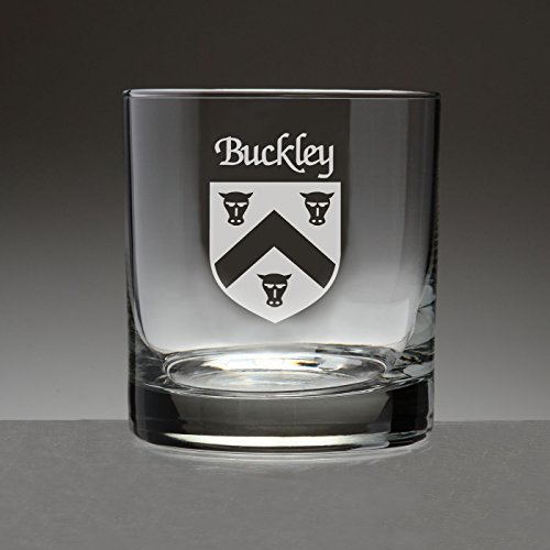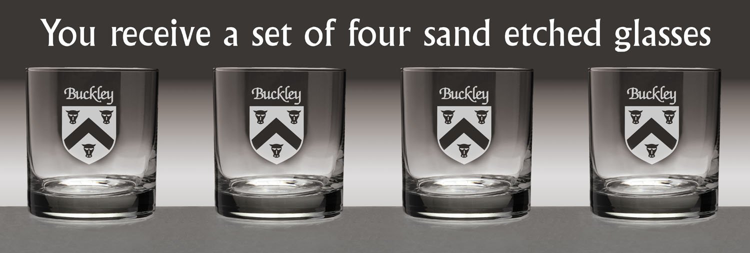 Buckley Irish Coat of Arms Tumbler Glasses If ye'll be havin' a wee bit of the Jameson whiskey on a cool evening, this will be the glass. Or Scotch, neat. A Cosmopolitan, perhaps. Or just a spot of lemonade, for that matter. Nicely balanced, clean-lined and just plain grown-up, the Tumbler's dignity is heightened by a sand-etched Irish coat of arms and family name. Why not yours? 11 oz. in size and dishwasher safe. Choose from over 1000 available Irish crests. USA.Washing Instructions:Dishwasher and microwave safe. Authentic Irish Family Coat of Arms Over 25 years of Heraldry Research Set of 4 Irish Coat of Arms Tumbler Glasses (Sand Etched) High quality sand etching with extra heavy basepattern:heavy basebottom diameter:3-3/16"maximum diameter:3-1/4"capacity:11 oz product height:3-1/2"