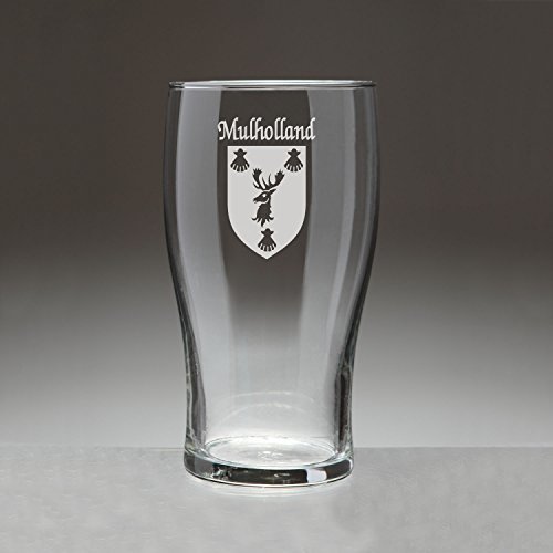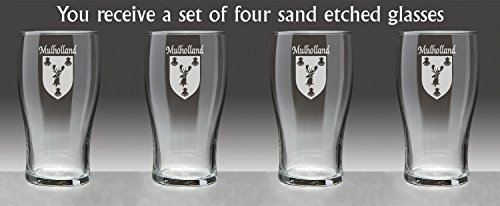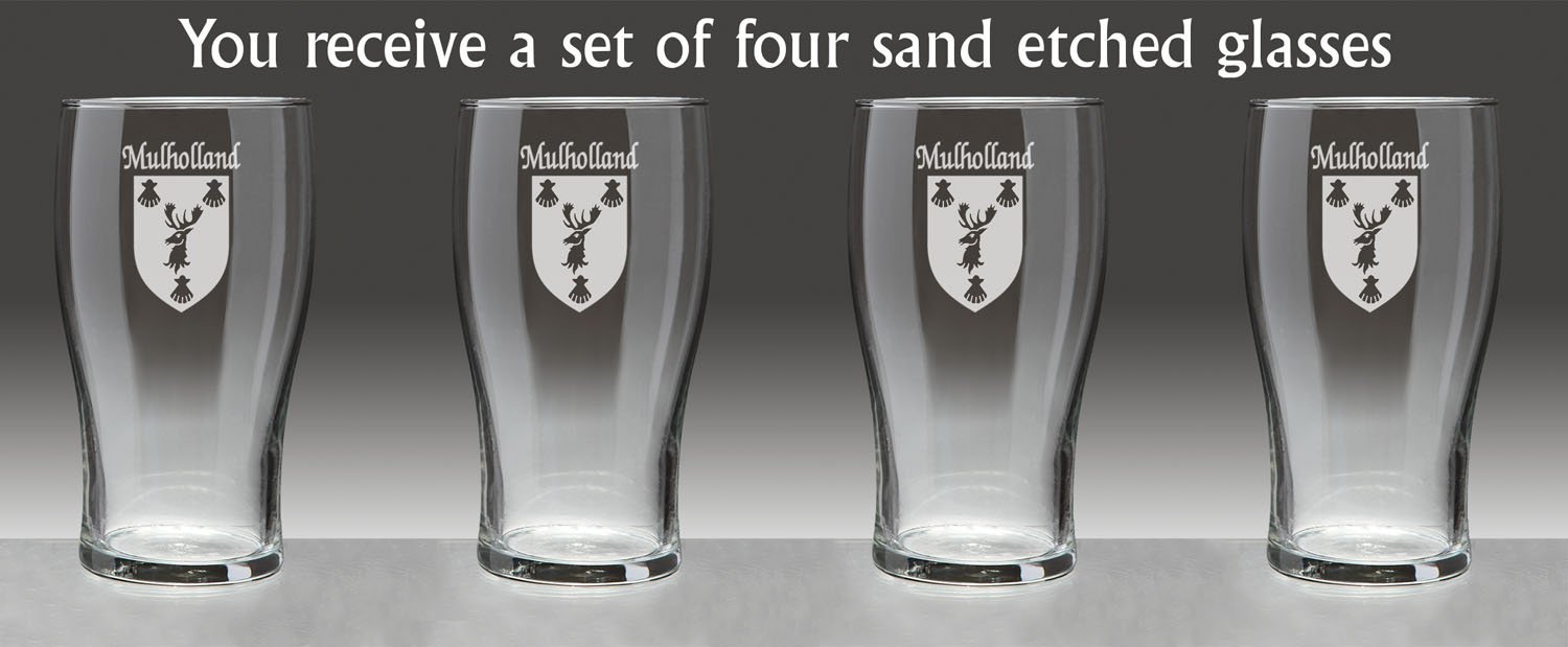Mulholland Irish Coat of Arms Tavern GlassesDanger: Curves ahead! From her hand-sized base to the gentle swell of her keel, this style of glassware is an age-old tradition on oaken bars all over the Celtic isles because of the wonderful balance, weight and durability she brings to the table.An official standard Irish pint at 20 oz., the Coat of Arms Tavern Glass features your permanently sand-etched Irish family coat of arms. Microwave and dishwasher safe.Choose from over 1200 available family Irish crests. Authentic Irish Family Coat of Arms Over 25 years of Heraldry Research Set of 4 Irish Coat of Arms Tavern Glasses (Sand Etched) High quality sand etchingEach glass holds 20 ounces of your favorite beverage