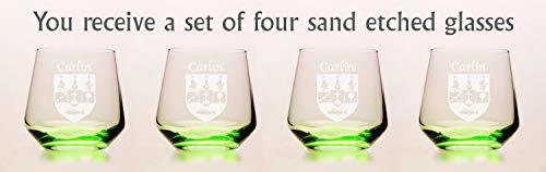 Product description: Carlin Irish Coat of Arms Green Tumbler Glasses - Set of 4 (Sand Etched). Whether you're having a glass of whiskey or scotch, a cocktail or just a glass of water, this brand new green tinted tumbler glass is the perfect choice. The new green color shines and reflects at different angles to beautifully remind you of the green pastures of Ireland with every sip. Each Irish coat of arms tumbler glass is permanently and professionally sand-etched with your surname and family crest. 13 oz. Choose from over 1000 available coat of arms.