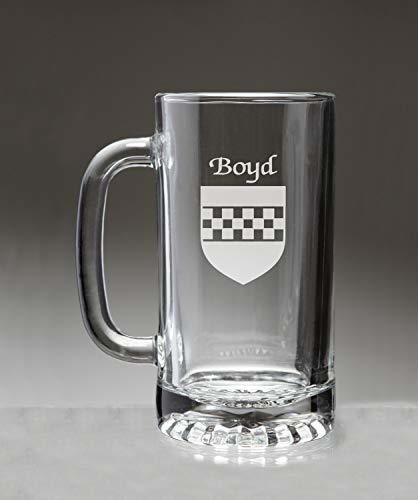 Boyd Irish Coat of Arms Beer Mug . This is the big beer mug with the handle that allows you to swing your glass while you're singing that Irish song. Or maybe just to have a drink with a heavy handled friend. High quality sand etched with your authentic Irish coat of arms and family name. Dishwasher and microwave safe. Capacity 16 oz and heavy duty double walled clear glass with handle. Choose from over 1200 available family Irish crests. Authentic Irish Family Coat of Arms. Over 25 years of Heraldry Research. Irish Coat of Arms Beer mug. High quality sand etching. Each glass holds 16 ounces of your favorite beverage.