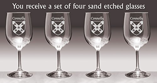 Connolly Irish Coat of Arms Wine GlassesWhat occasion couldn't be made more special with a toast? And how special would it be to toast with wine glasses etched with your authentic Irish name and coat of arms? For your most special occasions, or everyday weekday dinners, choose this durable, well-balanced and elegant wine glass, suitable for white or red. Each Irish coat of arms wine glass is permanently and professionaly sand-etched with your surname and family crest. 13 oz. Choose from over 1000 available coat of arms.Washing Instructions:Dishwasher and microwave safe. Authentic Irish Family Coat of Arms Over 25 years of Heraldry Research Set of 4 Irish Coat of Arms Wine Glasses (Sand Etched) High quality sand etching Each glass holds 13 ounces of your favorite Wine+Product height: 7-1/2"Maximum diameter: 3-3/8"Top diameter: 2-7/8"Bottom diameter: 3-1/4"