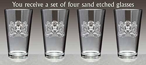 Conley Irish Coat of Arms Pint Glasses - Set of 4 (Sand etched) with our full coat of arms with lions and all. Did you know that the standard 20 oz. pint glass is enforced by the National Standards Authority of Ireland? A full Irish pint is a tradition (and a duty). The Irish Rose can etch over 1000 Irish family names and authentic coats of arms on these high-quality, recognizably Irish Pint Glasses. A perfect wedding, groomsman, reunion, any-occasion gift. Choose from over 1000 available family crests. Authentic Irish Family Coat of Arms. Over 25 years of Heraldry Research. Set of 4 Irish Coat of Arms Pint Glasses (Sand Etched). High quality sand etching with extra heavy base.capacity: 20 Oz. Product height: 6-3/8". Bottom diameter: 2-1/2". Top diameter: 3-3/4".