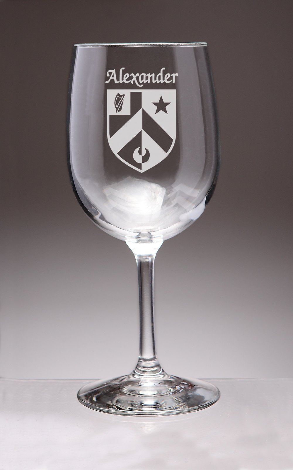 Alexander Irish Coat of Arms Wine GlassesWhat occasion couldn't be made more special with a toast? And how special would it be to toast with wine glasses etched with your authentic Irish name and coat of arms? For your most special occasions, or everyday weekday dinners, choose this durable, well-balanced and elegant wine glass, suitable for white or red. Each Irish coat of arms wine glass is permanently and professionaly sand-etched with your surname and family crest. 13 oz. Choose from over 1000 available coat of arms.Washing Instructions:Dishwasher and microwave safe. Authentic Irish Family Coat of Arms Over 25 years of Heraldry Research Set of 4 Irish Coat of Arms Wine Glasses (Sand Etched) High quality sand etching Each glass holds 13 ounces of your favorite Wine+Product height: 7-1/2"Maximum diameter: 3-3/8"Top diameter: 2-7/8"Bottom diameter: 3-1/4"