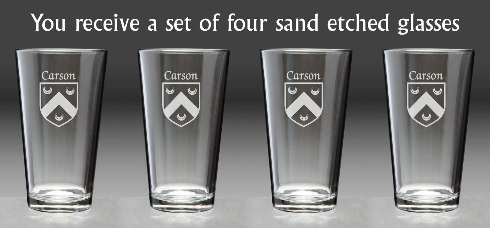 Carson Irish Coat of Arms Pint GlassesDid you know that the standard 20 oz. pint glass is enforced by the National Standards Authority of Ireland? A full Irish pint is a tradition (and a duty). The Irish Rose can etch over 1000 Irish family names and authentic coats of arms on these high-quality, recognizably Irish Pint Glasses. A perfect wedding, groomsman, reunion, any-occasion gift.20 oz., permanently sand-etched authentic Irish coat-of-arms, and dishwasher safe. Choose from over 1000 available family crests.Washing Instructions:Dishwasher and microwave safe. Authentic Irish Family Coat of Arms Over 25 years of Heraldry Research Set of 4 Irish Coat of Arms Pint Glasses (Sand Etched) High quality sand etching with extra heavy base capacity: 20 Ozmaterial: Glassproduct height: 6-3/8"bottom diameter: 2-1/2"top diameter: 3-3/4"